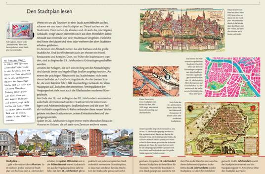 在本書裡,讀者可以了解到關於城市的一切:為什麼一座城市需要不同的建築?地底下有什麼看不到的通道?有哪些交通工具?不同的區域有什麼特點?歷史在城市中留下了什麼樣的足跡?以及現代的城市面臨哪些問題。而書本後附上的巨型海報,則展示出城市的不同區域,從以教堂為中心點的舊城區,穿過主要道路,最後來到市郊的工業區,這同時也是一座城市從古到今的時間發展。